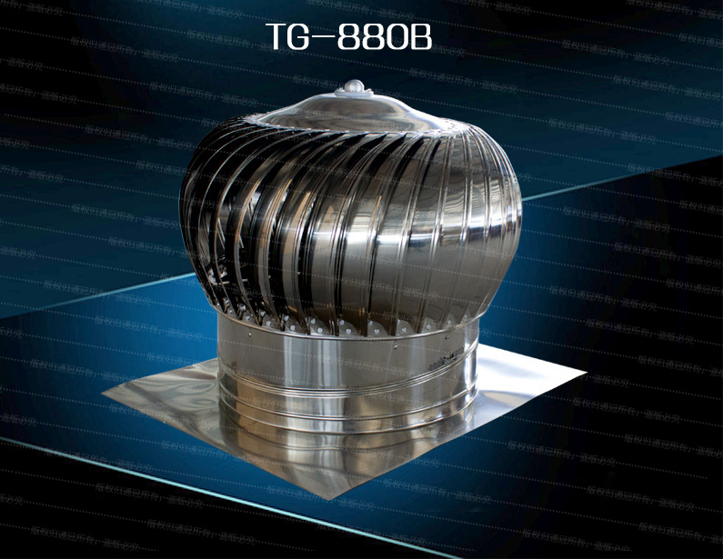 TG-880适用:大型工业厂房、仓库、大型建筑物、有害气体车间、 高温作业车间。说明:TG-880A由涡轮主机(使用美国进口UBC轴承), 上圆下 方加强型中座(将气流经收集后排出,增强主机的排气能效,尺 寸也可根据要求定制),底板座(适用于不同坡度屋面,调节主机水平 垂直,使得风机可以在屋面任意位置安装)组成。风机球径880MM , 喉径680MM。风机每小时换气量2600-6500M3 。可以提供多种材质:不 锈钢,氟碳涂层铝合金,光铝,镀锌板等! 新款将轴承内置于高密封 性的油缸内,避免微小颗粒进入其间 隙!耐腐蚀,持久润滑!轴距缩短,同心度更好,增强其通风效果! 改变原始平撑设计,抗压力可达100kg,稳固性更好! |