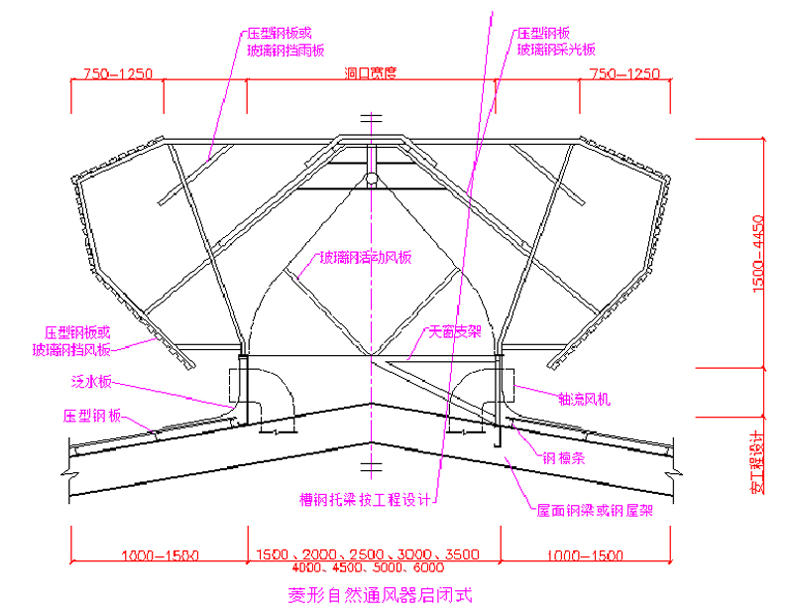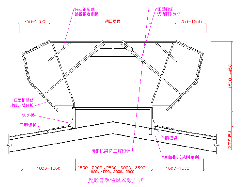 3000×n、4000×n (用于压型钢板或现浇混凝土屋面) 6000×n (用于预应力钢筋混凝土屋面板屋面) |